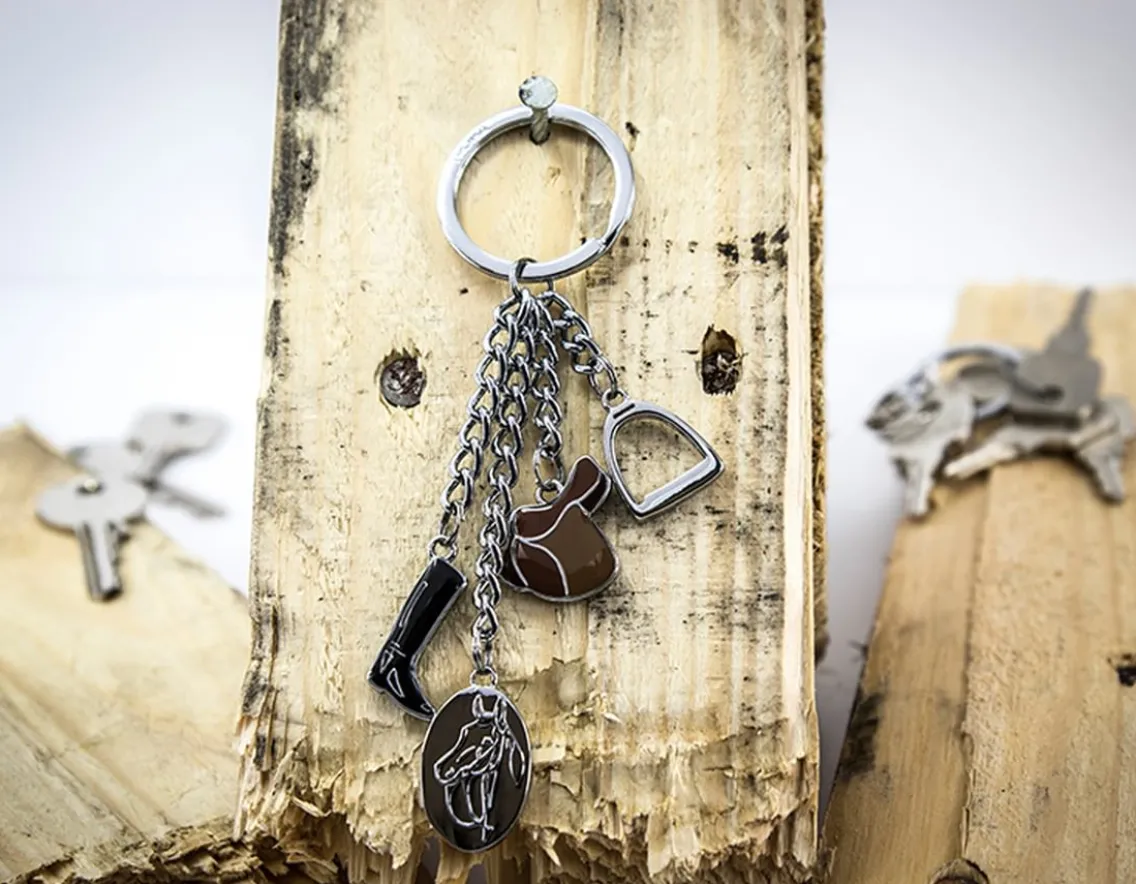 This beautifully weighted keyring has four individual charms including a stirrup, riding boot, saddle and horse plaque and looks great on a school bag too. From German company Troika, this shiny chrome plated split ring keyring comes presented in a gift box with an internal pouch. Celebrate the joy of horse riding with this lovely present, perfect for horse and pony lovers.