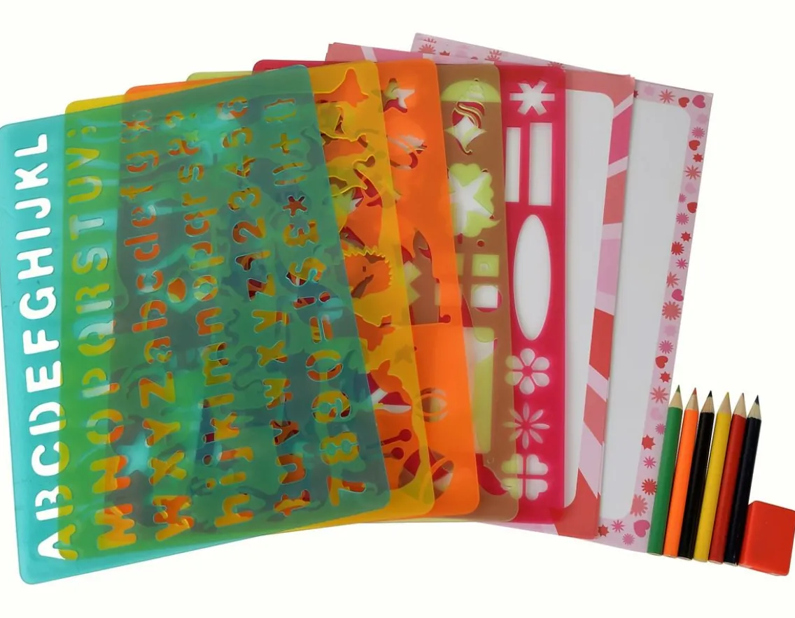 Fun box of assorted stencils with coloured pencils and paper.