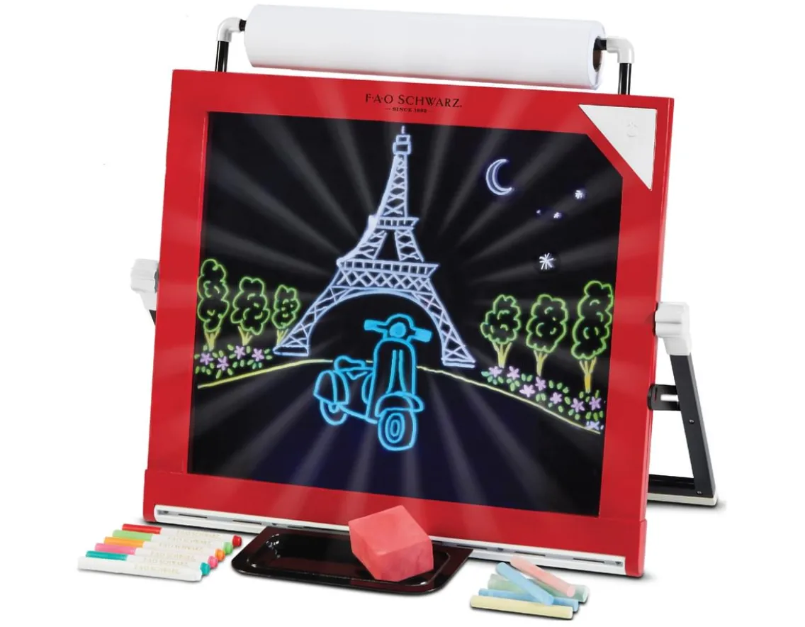 Encourage little artists with this brilliant art station from FAO Schwarz. Measuring 43cm wide, it allows you to create in three different ways – with a light-up LED screen, chalk blackboard and traditional paper too. Use six special markers to draw on the transparent surface, then watch as five funky light modes bring your masterpiece to life! Simply flip to access the chalk board, or unfurl paper from the 15m roll. Move over, Van Gogh!