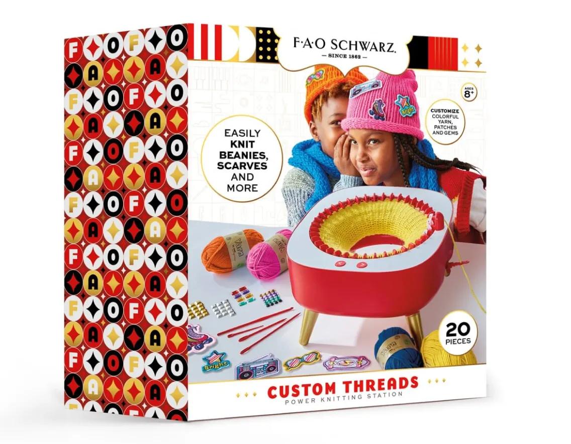 Easily knit your own accessories with this smart machine! It features 40 rotating hooks and two weave modes – create tubes for beanies and sleeves, or flat knit fabric for scarves & more. Simply hold down the button on the battery-powered unit or turn the handle and the yarn will catch each hook as they pass. Customise your knitted creations with stick-on gems and funky iron-on patches. Includes four funky colours of yarn too. Sew much fun!