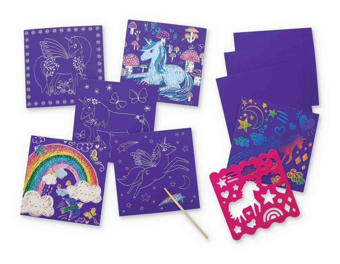 This creative unicorn art set includes 15 premium scratch-off drawing sheets, each measuring 17cm squared. Using the wooden stylus, gently scratch the purple surface to reveal the colourful and sparkly patterns underneath. Follow the ten pre-designed sheets of unicorns, rainbows and more – or use the five blank ones and the included stencils to make your own gorgeous creations! A fabulous creative set, perfect for artistic unicorn fans.