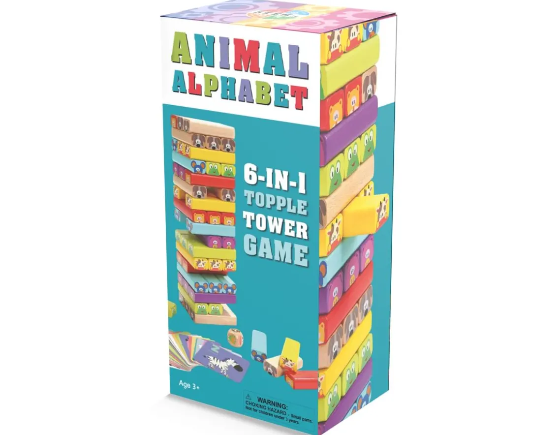 Colourful wooden building blocks with animal themes, 6 different games to play.
