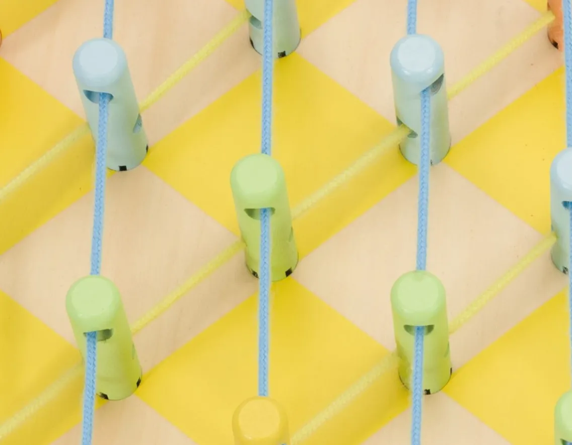 Insert wooden pegs and lace with string to create funky designs.
