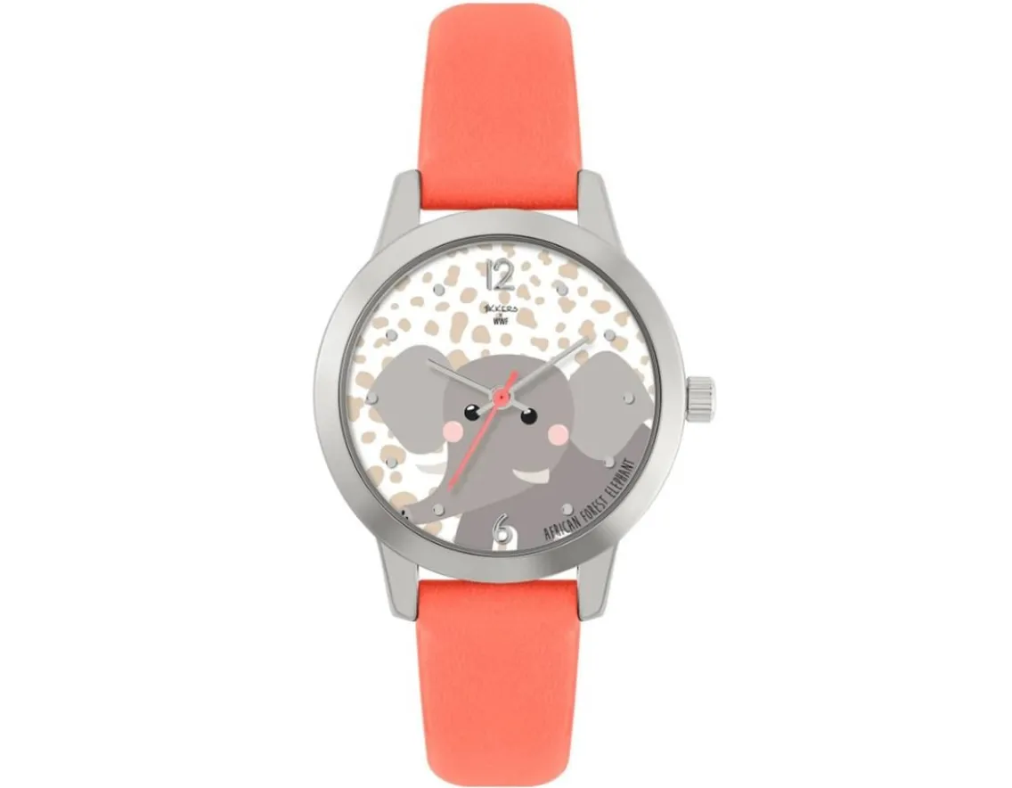 Presented in a 15cm gift box, this adorable elephant watch is a must-have accessory. Smart and stylish with a bright coral-coloured strap and silver buckle, learn to tell the time with your first analogue watch. Made in collaboration with WWF, a friendly African Elephant decorates the dial, blushing in front of an animal-print background. A fashionable and wonderfully fun first watch, a simply great choice for animal fans – elefantastic!