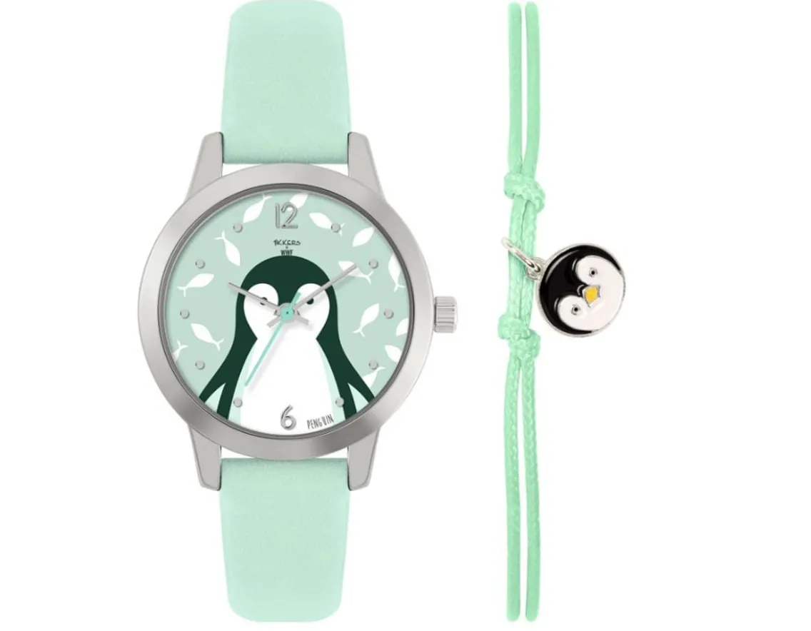 Presented in a 15cm gift box, this cute penguin watch is a great choice for animal fans. Smart and stylish with a colourful strap and silver buckle, learn to tell the time with your first analogue watch. Made in collaboration with WWF, a happy penguin surrounded by lovely little fish decorates the dial. Complete with an adjustable matching waxed cord bracelet, embellished with an adorable charm. A fashionable and wonderfully fun first watch – cute!