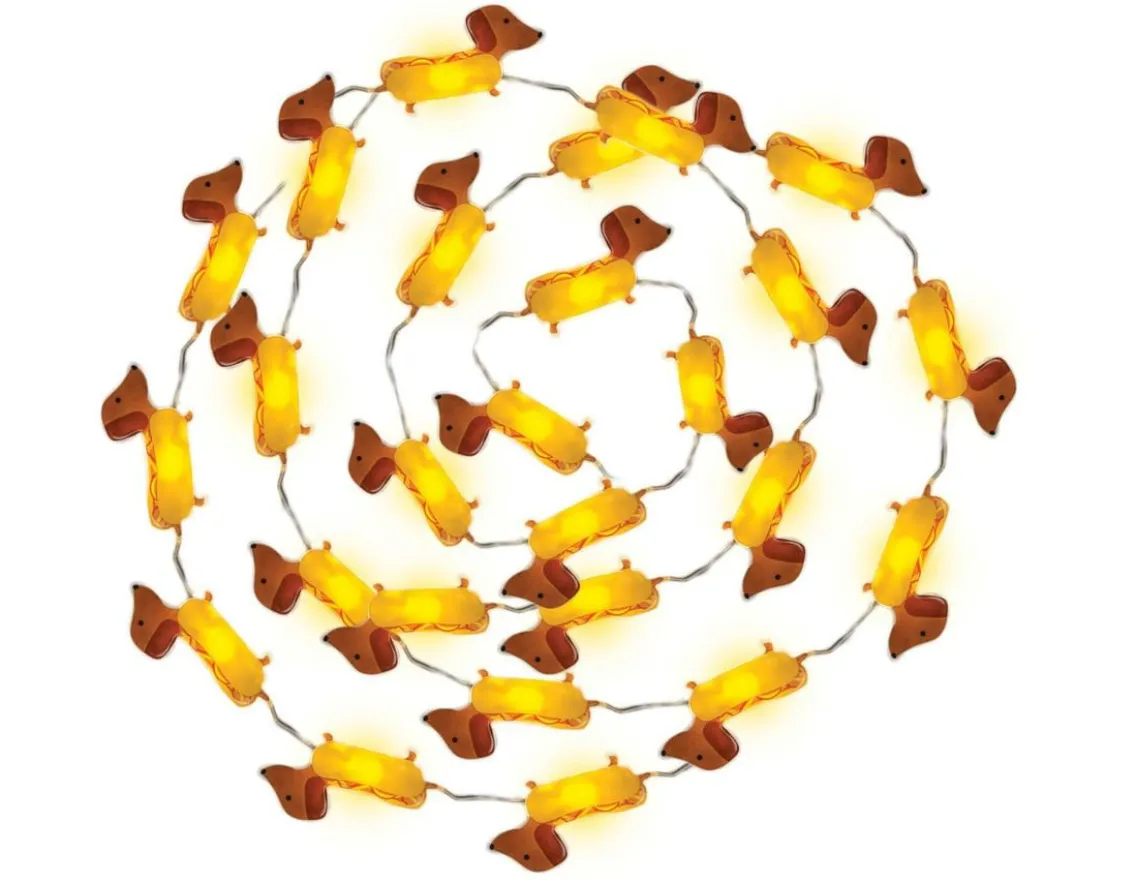 This trendy 2-metre string is adorned with 20 adorable LED lights shaped like mini sausage dogs. These charming dachshunds glow a warm, white light, making them perfect for brightening up any bedroom or desk area. Great for bringing quirky style to a mirror, a bookshelf, or the space above your bed, the bendy wire makes them super easy to hang. Powered by a handy battery pack, these hot dogs make any space more groovy – pawfect!