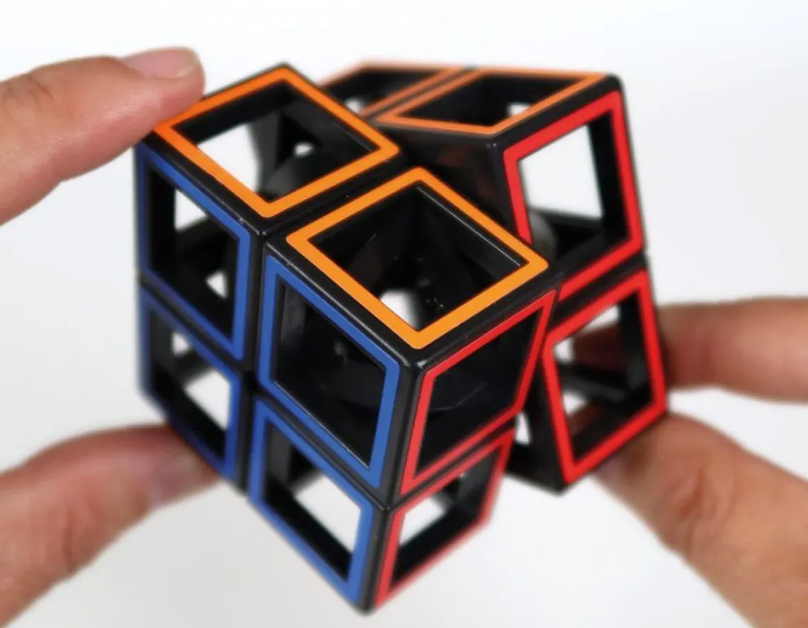 Brain-teasing twisty 2X2 puzzle cube with hollow pieces.