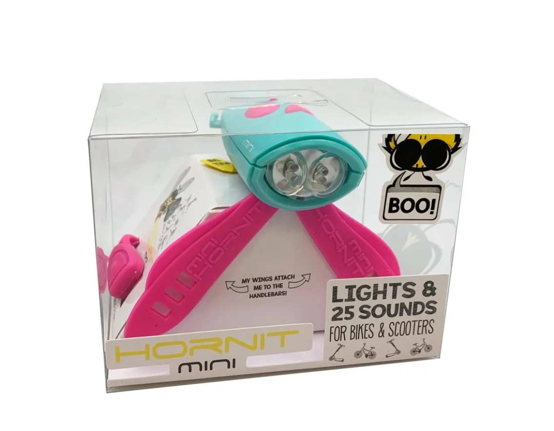 This brilliant Mini Hornit is loaded with 25 fun sounds including a dixie horn, magic spell, horse, rooster, a lion’s roar and even an old-fashioned bike bell! The sounds have three different volumes, plus it has white and green lights, with flashing or constant settings. Durable and waterproof, the Turquoise and Pink Hornit attaches easily to the handlebars of any bike or scooter, with an optional remote trigger for bike handles, meaning you don’t need to let go to sound it. Makes riding a bike even more fun – sound that Hornit!