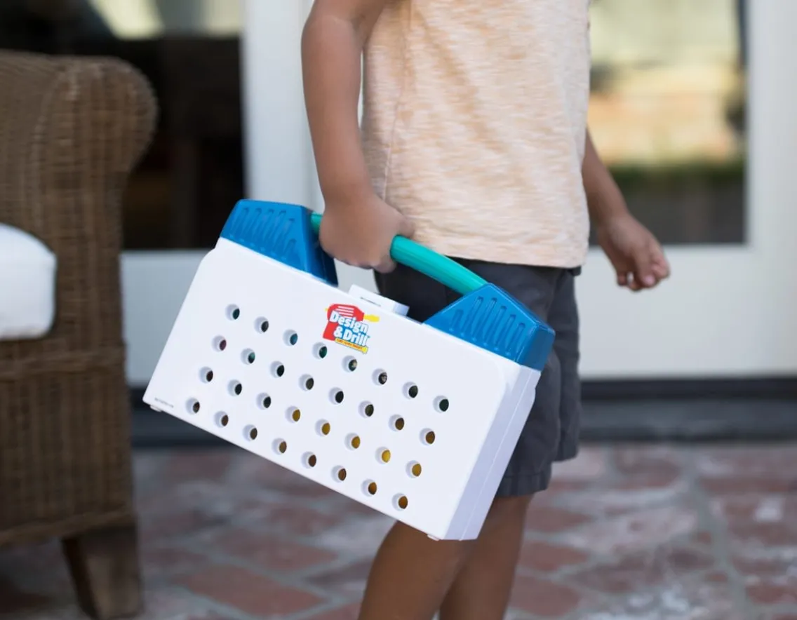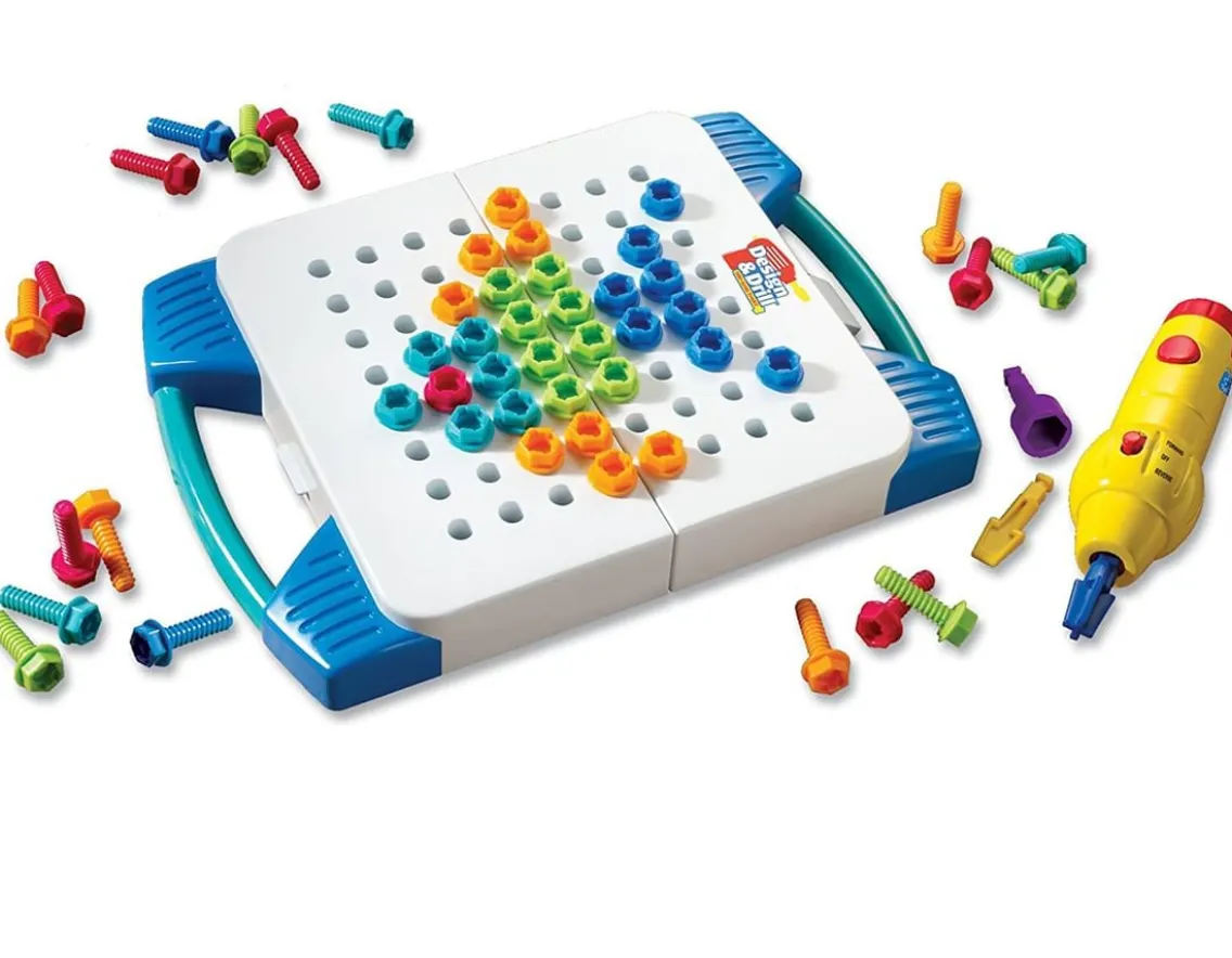 Make your own patterns on the go with this unique take-along tool kit! Simply unfold the sturdy carry case to reveal a 28cm design board. Screw in the 60 colourful plastic bolts using the battery-powered tool to create imaginative patterns – or copy one of the designs from the enclosed booklet. The tool includes three interchangeable heads including a Phillips and a socket bit too. Great fun for budding builders – construction meets creativity!