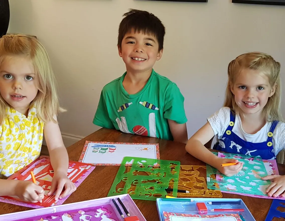 Fun box of assorted stencils with coloured pencils and paper.
