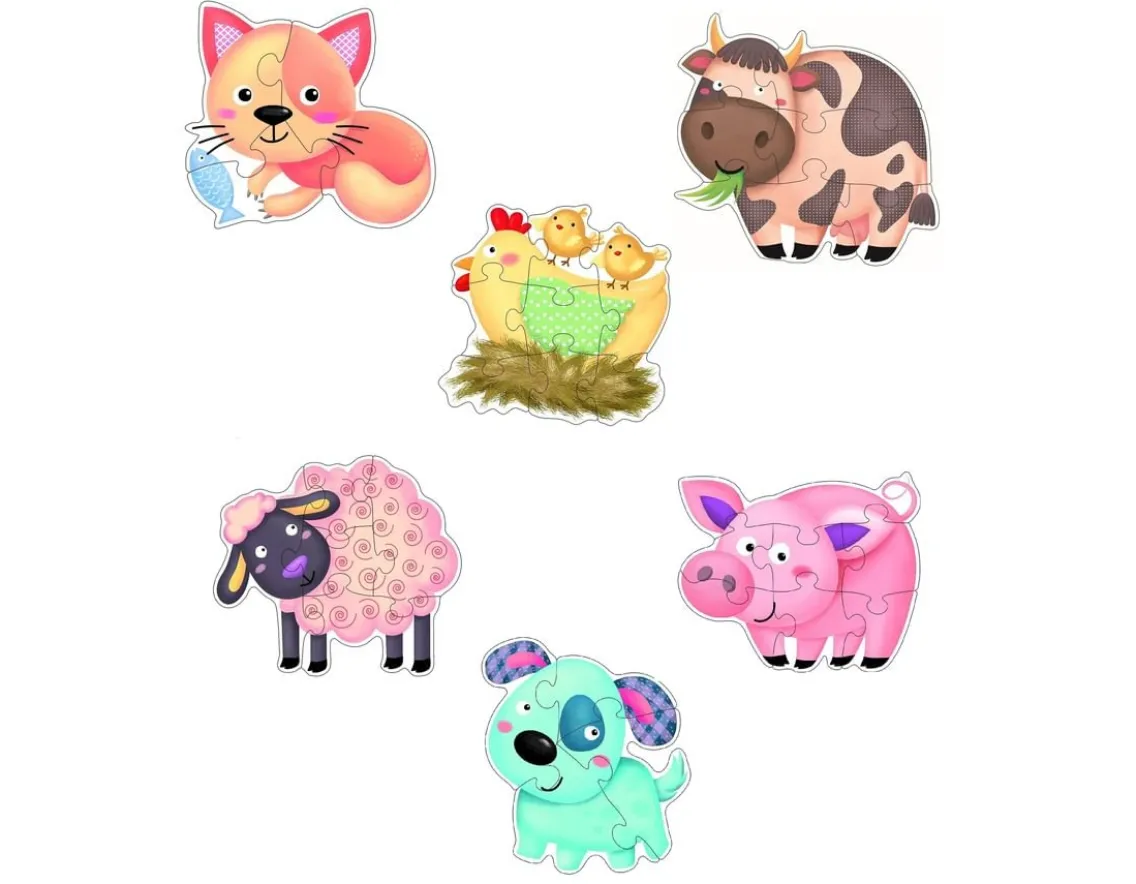 Set of six double-sided farmyard board puzzles to colour in with bright felt tips.