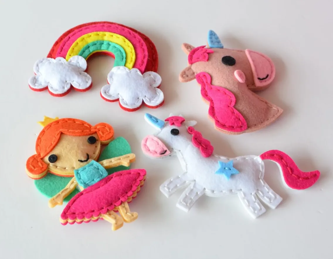 Easily sew four sweet felt projects – a happy fairy, a colourful rainbow and two cute unicorns.