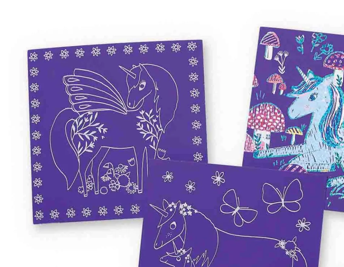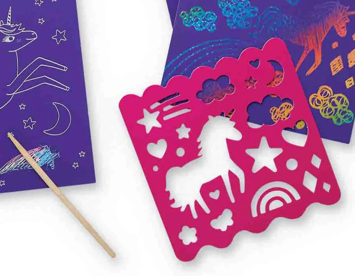 This creative unicorn art set includes 15 premium scratch-off drawing sheets, each measuring 17cm squared. Using the wooden stylus, gently scratch the purple surface to reveal the colourful and sparkly patterns underneath. Follow the ten pre-designed sheets of unicorns, rainbows and more – or use the five blank ones and the included stencils to make your own gorgeous creations! A fabulous creative set, perfect for artistic unicorn fans.