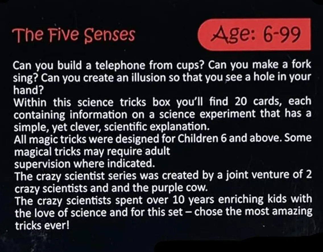 Perfect for curious kids, this brilliant set includes 20 cards, each detailing a “magic trick” demonstrating a scientific concept. Can you build a telephone from cups or make a fork sing? What about creating an illusion so that you see a hole in your hand? Using simple household items, explore the wonders of the five senses with the Crazy Scientist and fool your friends into thinking you’re a real magician. Science meets magic – very exciting!