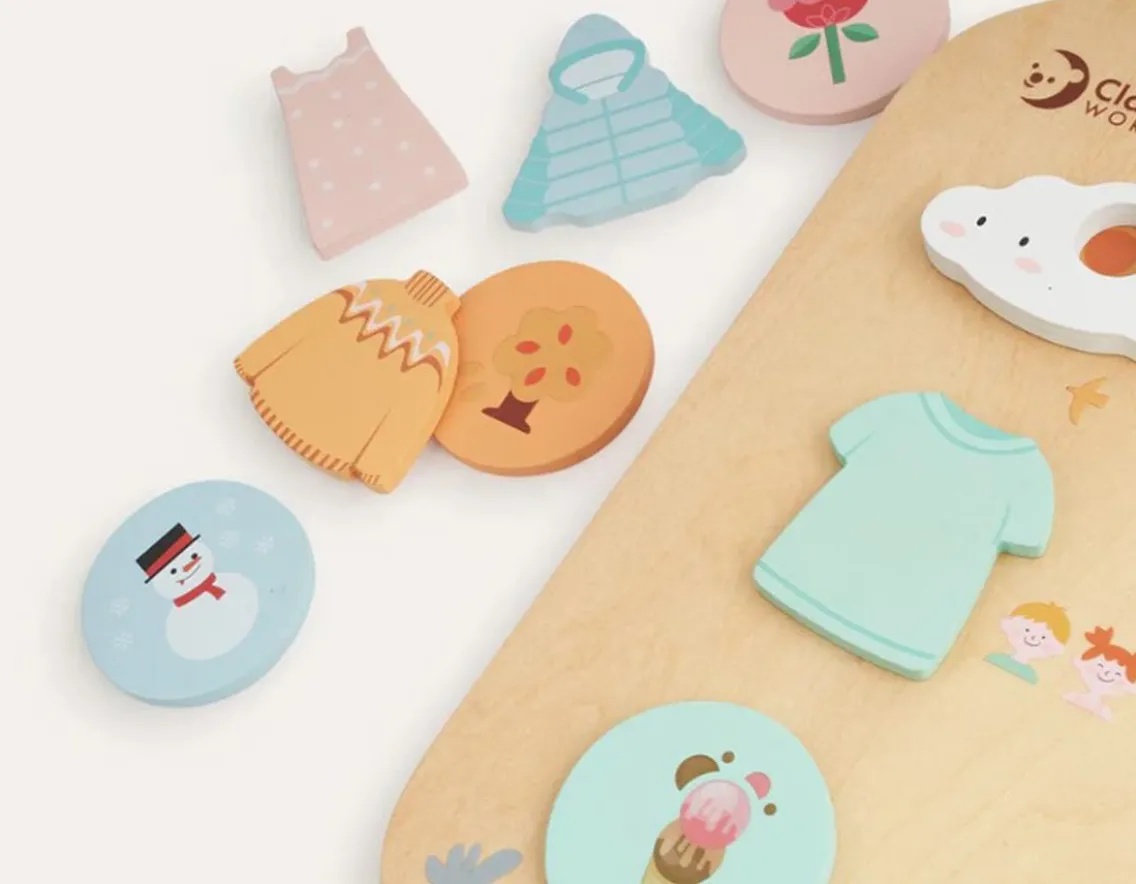 This lovely wooden toy lets helps kids explore and understand the weather. Move the pieces to reflect the conditions on the day. Is it rainy, windy, snowing or sunny? Adjust the temperature gauge to suit, then choose between a dress, t-shirt or woolly jumper to best fit the weather. Measuring 39cm wide and made of natural wood, you can display your barometer using the attached string. Educational and fun, whatever the weather.