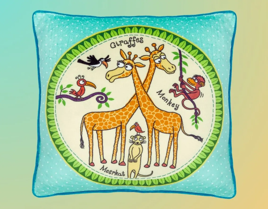 This plush cushion is sure to bring a bit of flair to any bedroom. The double-sided design features a bold jungle scene as well as colourful animal doodles. From meerkats and monkeys to a whole elephant family, there’s so much to discover. Measuring 40cm, the cushion has a removeable cover made of soft polyester, machine washable at 30°. With bright colours and blue piping too – the perfect place for an animal fan to rest their head!