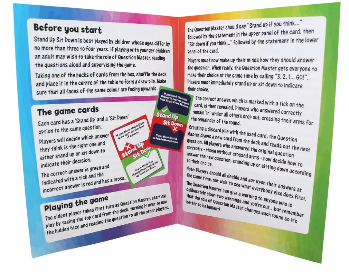 There are 400 question cards with two possible answers, you just have to decide which one is right. You don’t shout out the answers, you don’t even need to know them, simply stand up or sit down to show your choice. Stand Up if you think that the strongest animal for their body weight is an ant…Sit Down if you think that it’s a gorilla. Which grows up…stalactite or stalagmite? A fast paced energetic trivia game – fun and educational too!