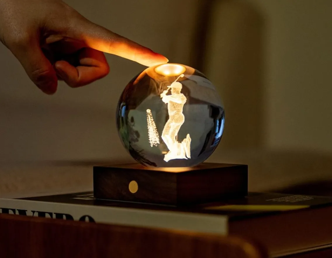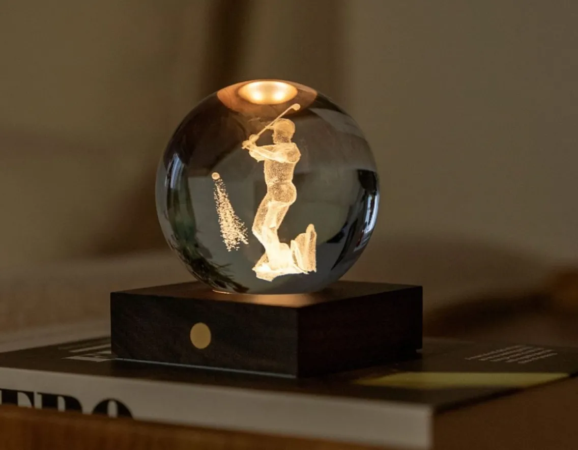Let the light shine with this luxury crystal ball light featuring a 3D laser-engraved golf design. Simply touch the copper button to cycle through 3 brightness levels. The built-in light shines through the 8cm polished glass orb and the 3D engraving glows warmly, adding presence to any room. The walnut base is fitted with a rechargeable battery that can provide up to 16 hours of light on a single charge. The perfect present for any golfing fan.