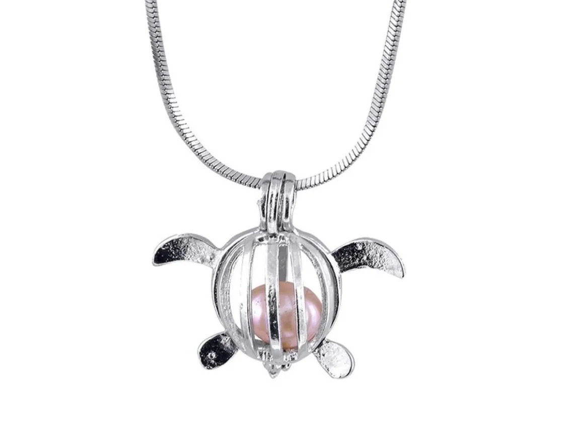 A beautiful genuine pearl in its original shell with a pretty turtle pendant and necklace.