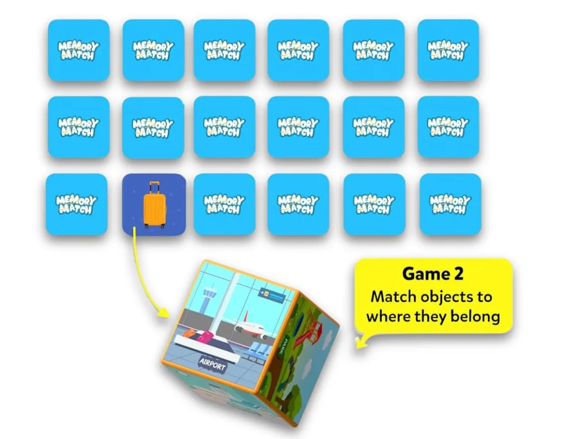 Which of these three objects lives at the beach… Suitcase, Seashell or Stethoscope? In this brilliant memory game, roll the wooden dice and flip over the tiles as you search for objects that match your location. From the park to the airport, there are lots of familiar things to spot! Gather six objects that match your location card to win. Great for observation and logic skills, the whole family can play this fun game together. A memory marvel!
