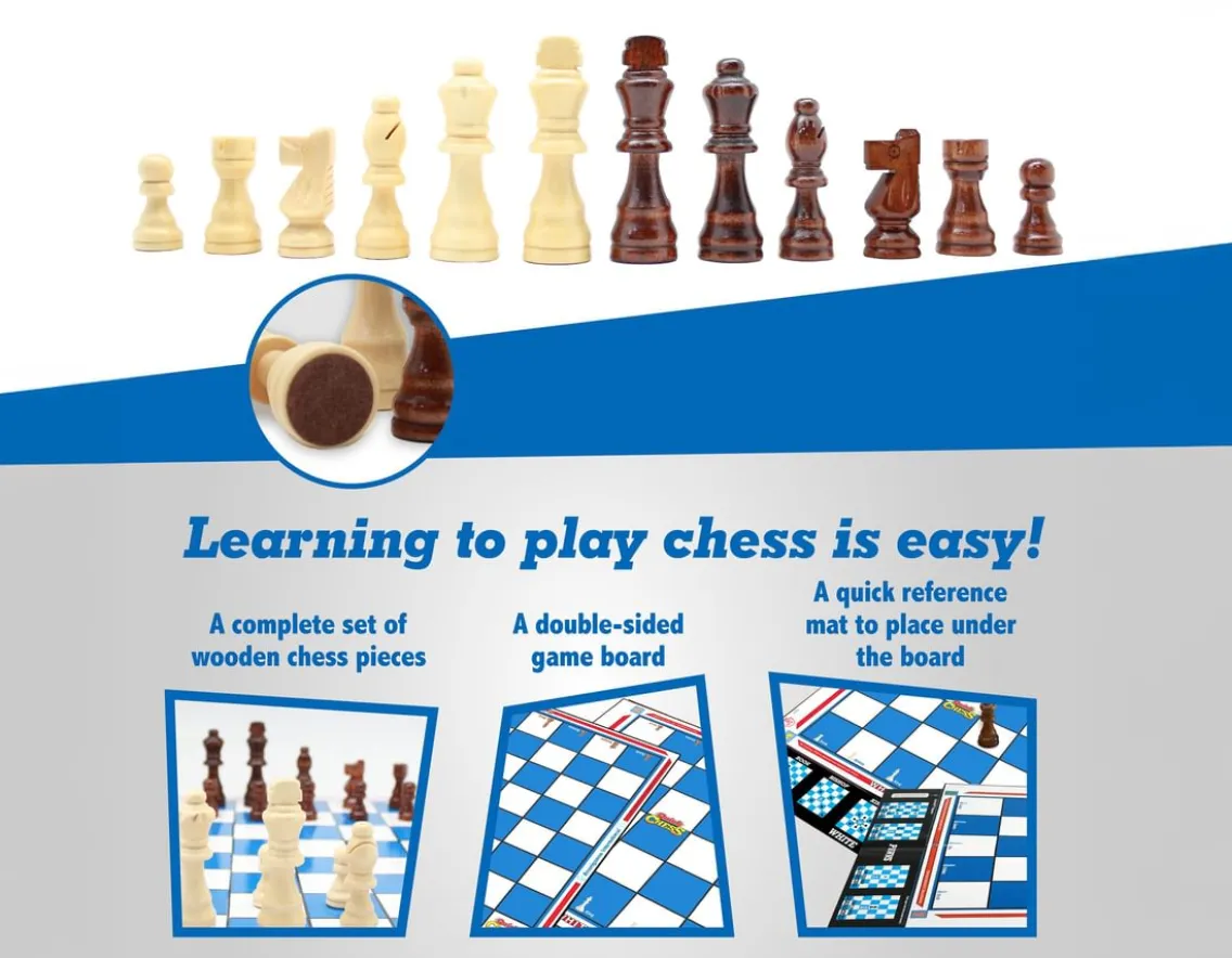 This clever award-winning set removes the major problem of learning chess, how pieces move. First, learn on the simplified board with easy play games, each focused on one piece, to teach players every move. You can be playing basic chess in just 10 minutes! The double-sided game board can then be flipped and used for a full game of chess, with a quick reference mat to help as you play. With wooden pieces, a brilliant present to inspire – check!