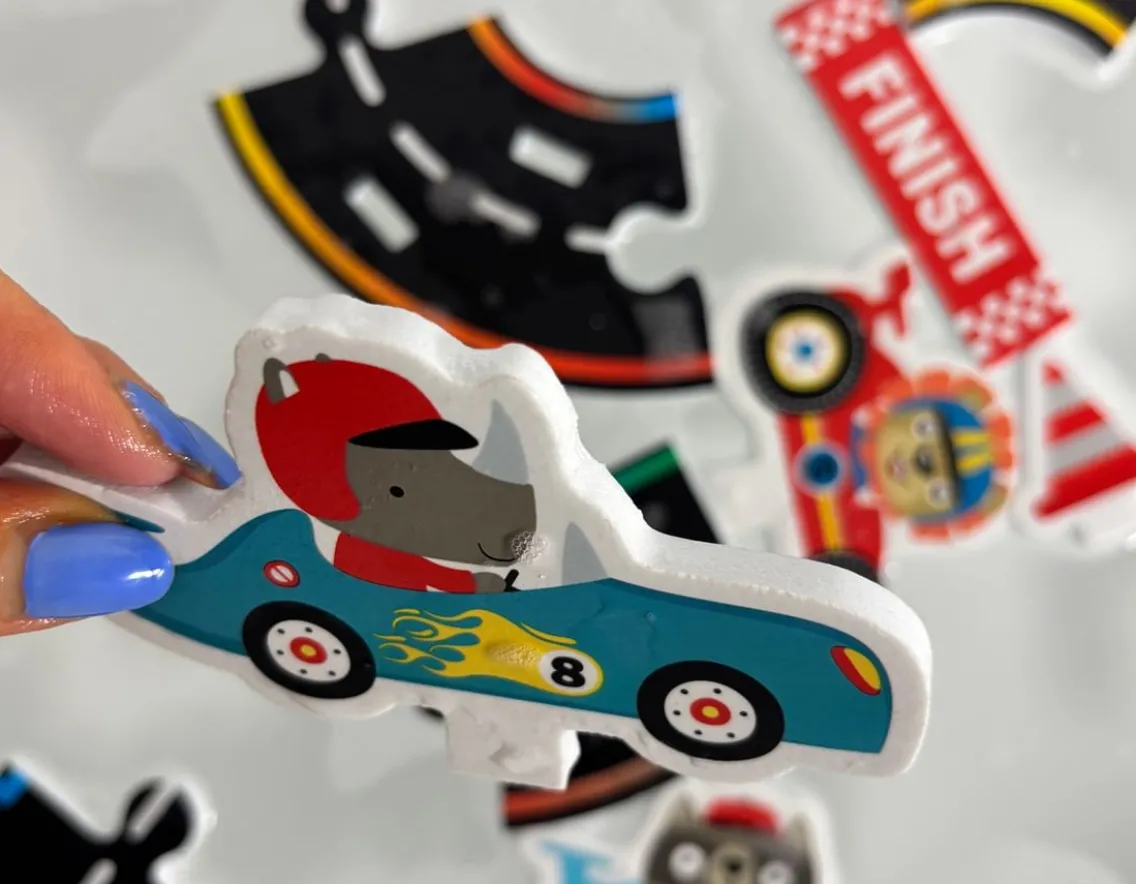 This brilliant set contains 35 pieces to stage your own Grand Prix in the bath! Put together the race track like a jigsaw puzzle, then float it on the surface of the water. Decorate the tub or tiles with foam stickers of animal racers, then have fun squirting water with the two soft cars. When the fun is over, your happy little driver can store everything in a suction cup mesh bag ready for the next race. Life in the fast lane, whilst getting very clean!