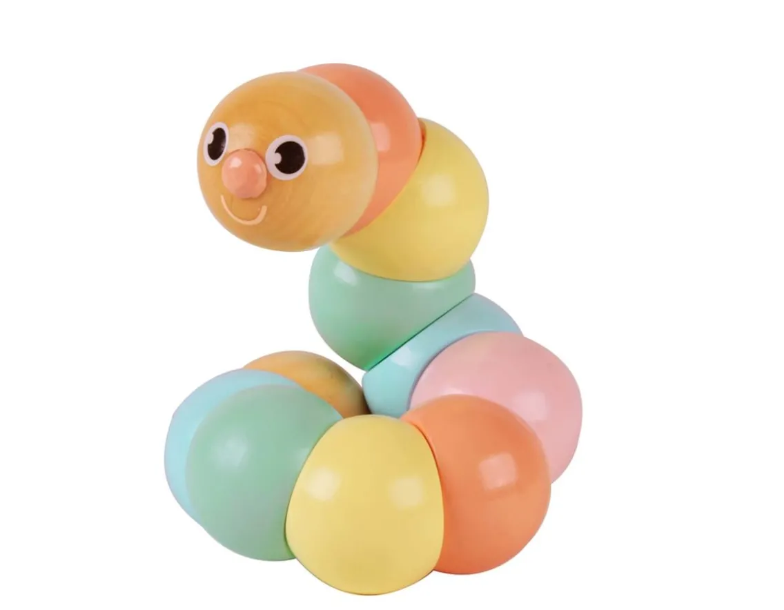 This cheerful caterpillar is sure to be a hit with any curious tot. Measuring 22cm, its body is made up of eleven offset beads on a sturdy elasticated cord. Simply twist or shake to watch it wiggle and dance! Sustainably crafted from FSC-certified wood, the caterpillar is decorated with a pastel rainbow design in non-toxic paint, complete with a happy smile and pink nose. A lovely traditional toy for little ones to explore. What a wiggly wonder!